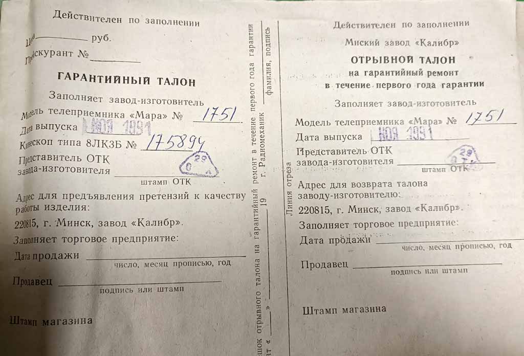Модель телеприёмника "Мара" выпускалась возможно с 1991 года Минским заводом "Калибр". 12 каналов. Питание от сети через БП.