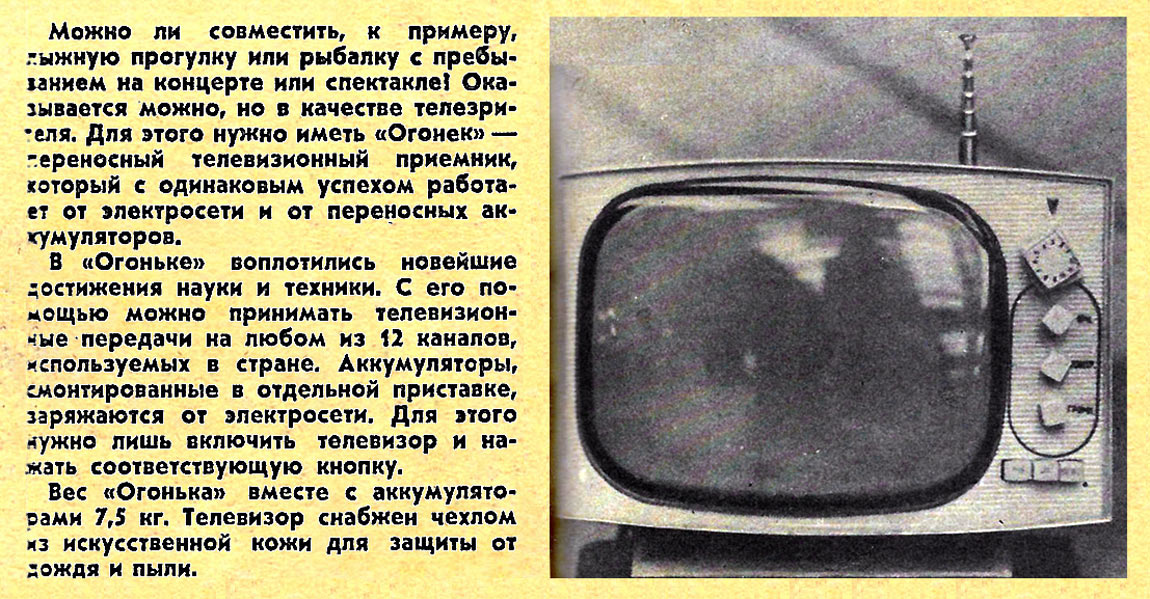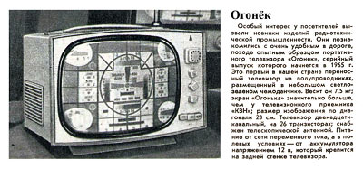 Портативный транзисторный телевизор ч/б изображения "Огонёк" подготовлен к выпуску с 1965 года.