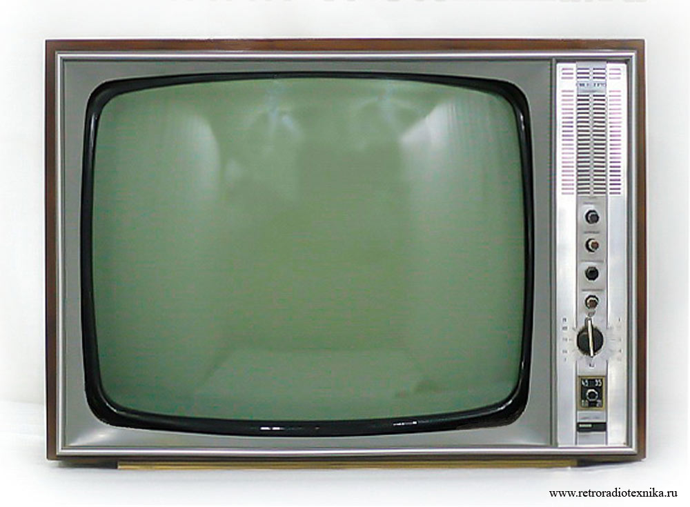 мощность 80 Вт. Габариты телевизора 685х490х395 мм. Масса 37,5 кг. С 1973