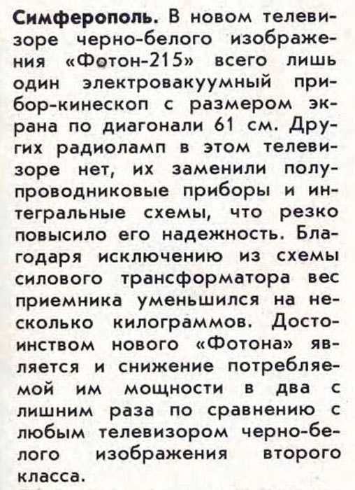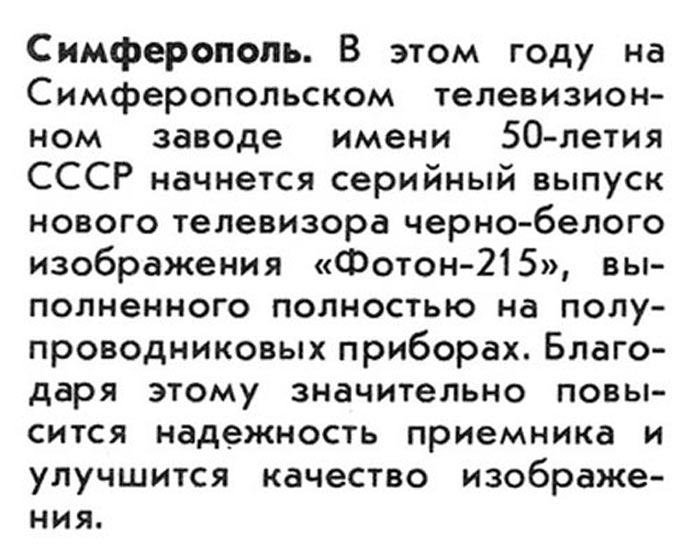 Телевизор "Фотон-215" подготовлен к выпуску с 1977 года Симферопольским заводом телевизоров имени 50-летия СССР.