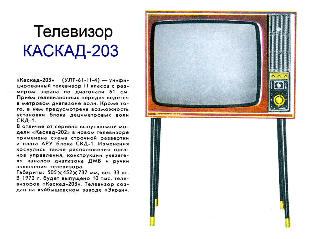 С 1972 года завод выпускает телевизор "Каскад-203", которых выпущено 213