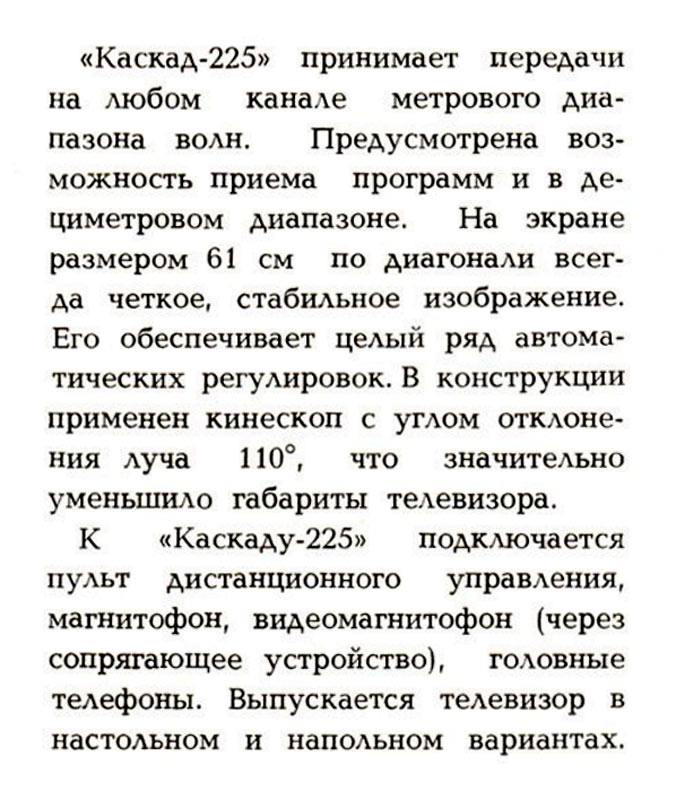 электронного луча 110°. Телевизоры ''Каскад-225'' и ''Каскад-225Д'' обеспечивают