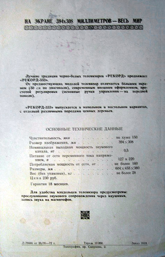 смене названия и кинескопа. В "новом" телевизоре "Рекорд-333" установлен