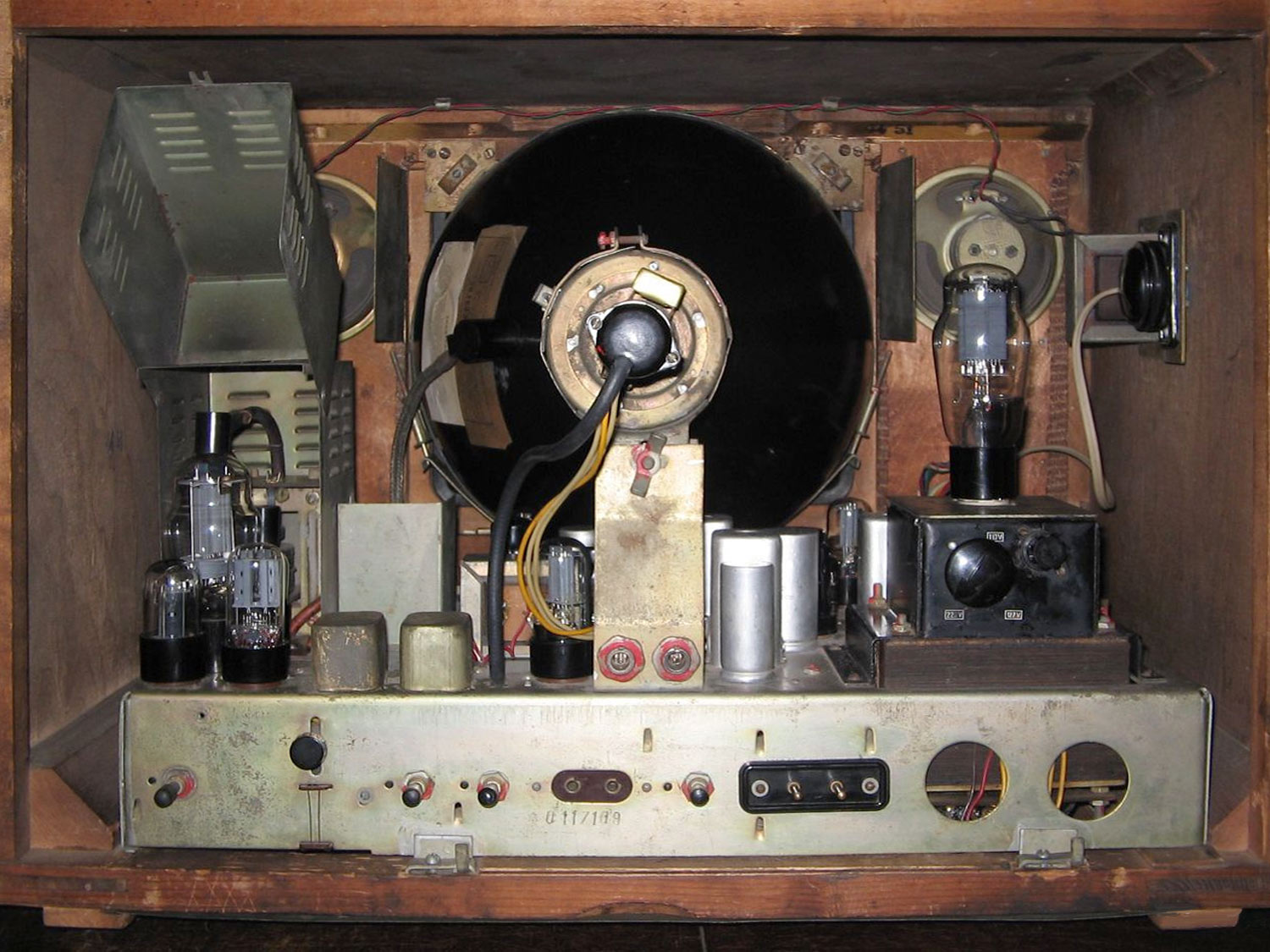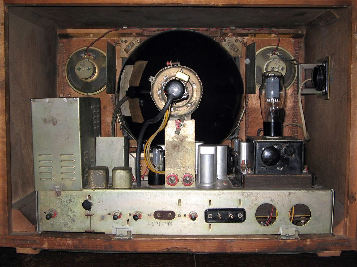 шасси из металла, помещённое в ящик из полированного дерева. Габариты телевизора