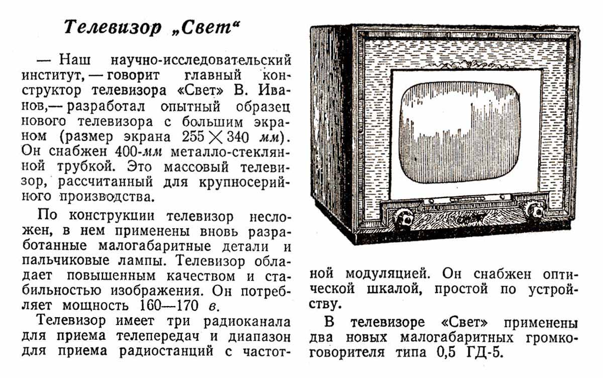 году. Опытный телевизор ''Свет'' был разработан в Москве группой конструкторов