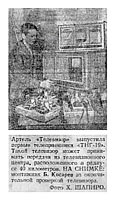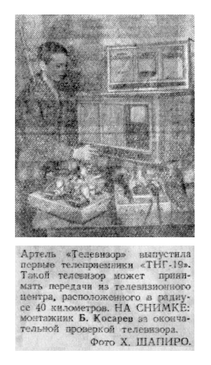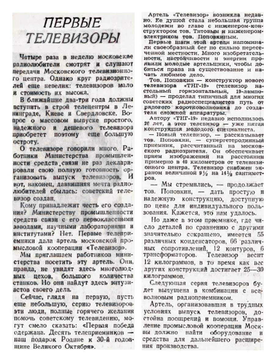 Телевизионный приёмник "ТНГ-19" (Телевизор Настольный Горизонтальный 19-ламповый) малосерийно с осени 1947 года выпускала артель "Телевизор", Москва.