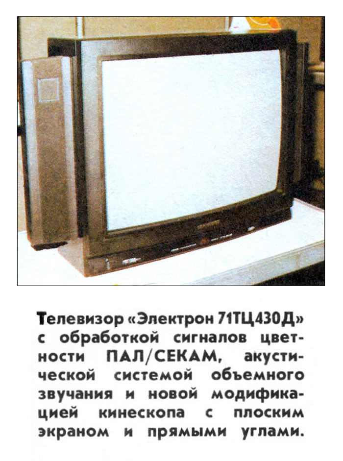 Телевизионный приёмник цветного изображения "Электрон 71ТЦ-430Д" разработан в 1989 году Львовским ПО "Электрон". Выставочный образец.