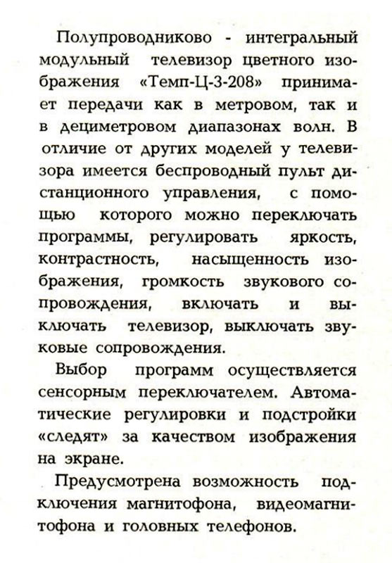 Цветной телевизор "Темп Ц3-208" планировал к выпуску с 1984 года Московский радиозавод "Темп". Каталог "Товары народного потребления" за 1984 г.