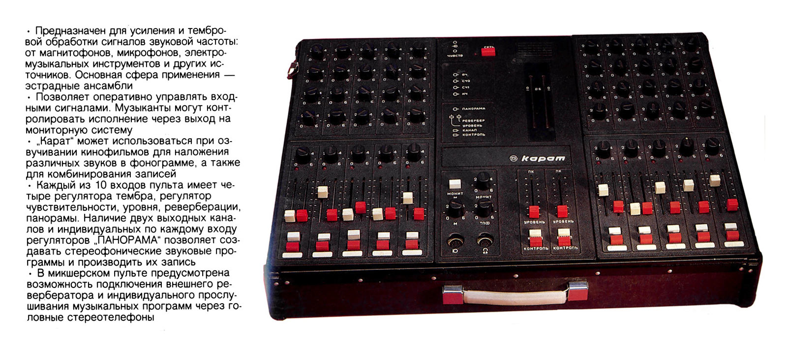 Инструкция по эксплуатации микшерского пульта "Карат" (Маслов Андрей Александрович). Электрическая схема пульта. Советский рекламный ролик о пульте "Карат".