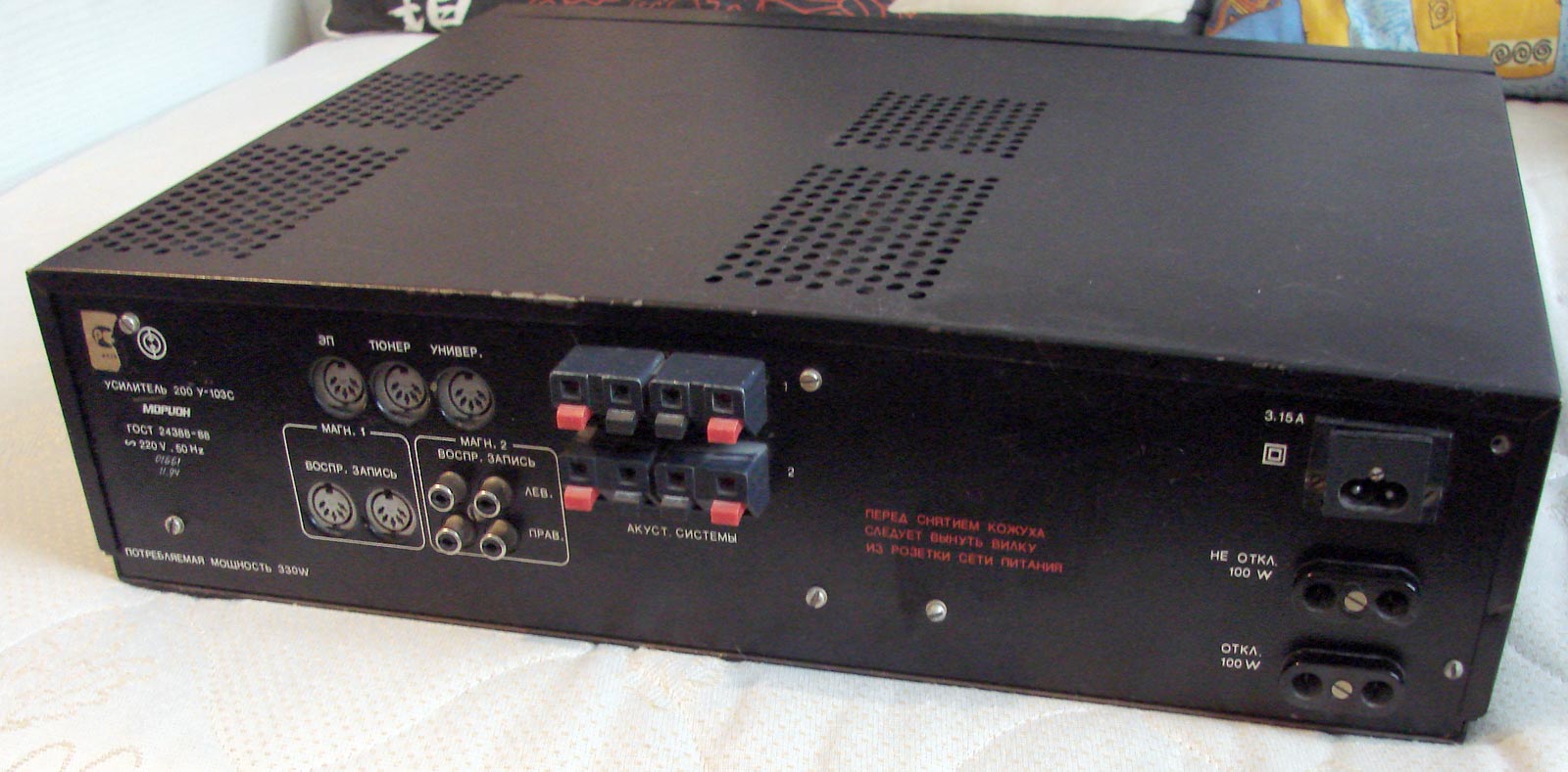 потребляемая мощность 400 Вт. Габариты усилителя без упаковки 362x430x110