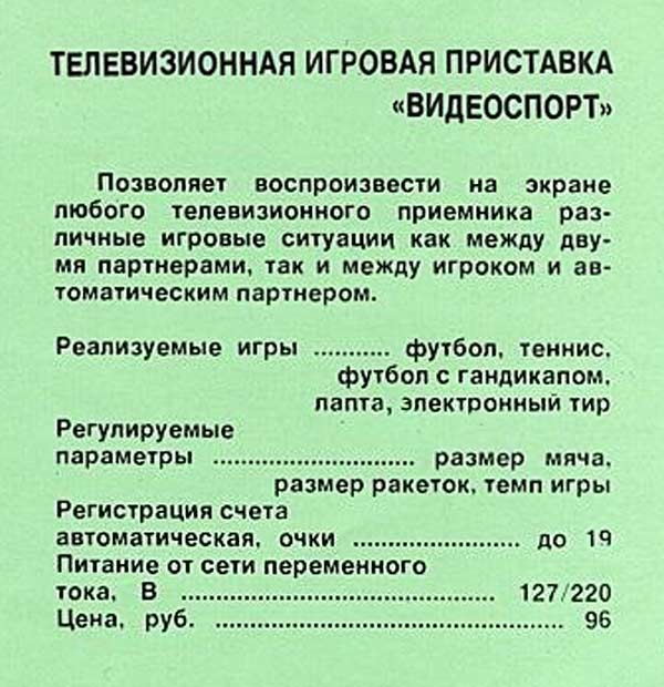 до 100 очков обнуляются. Питание - сеть 220 В. С 1982 года выпускалась игровая приставка "Видеоспорт-2" и практически повторяла игровую приставку "Видеоспорт".