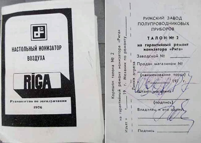 Портативный настольный ионизатор воздуха "Рига" (Riga) выпускался предположительно с 1975 года Рижским заводом полупроводниковых приборов.
