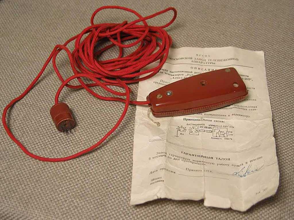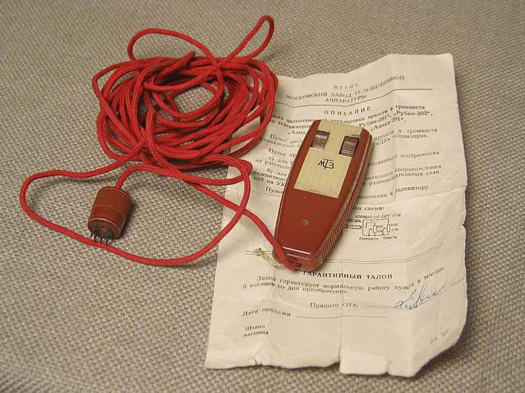 Пульт дистанционного управления для телевизоров "Рубин" с 1958 года выпускал Московский завод телевизионной аппаратуры. Управление яркостью и громкостью. Длина провода 7 м.