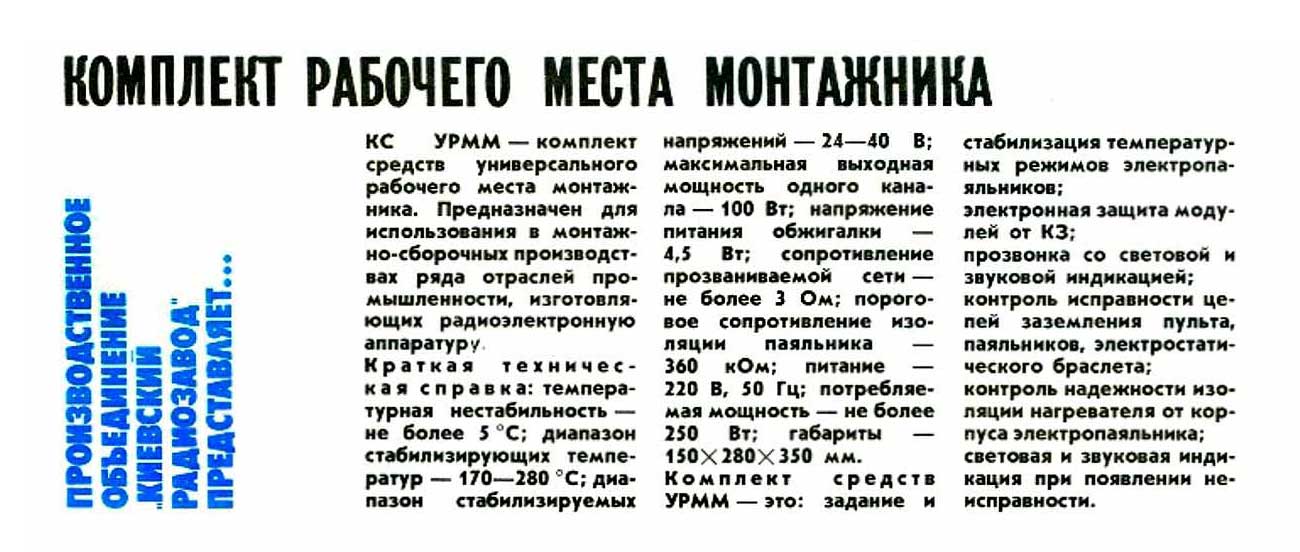 Комплект средств универсального рабочего места монтажника "КС УРММ" подготовлен к производству с 1993 года производственным объединением "Киевский радиозавод". ж. НТ № 2.1993 г.